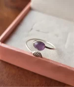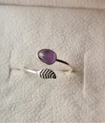 A gorgeous sterling silver ring, featuring a pear-shaped Amethyst gemstone set against a textured leaf design, offering a blend of elegance and nature-inspired beauty.