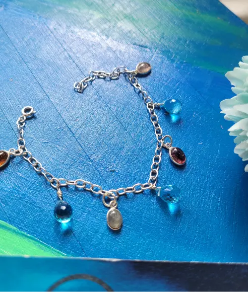 A single-chain bracelet, adorned with vibrant Tourmaline gemstone charms, set in 92.5 Sterling Silver, offering a perfect balance of elegance and positive energy.